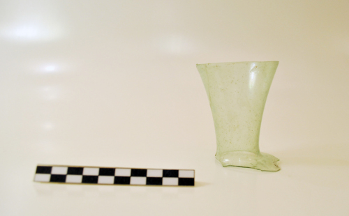 Bottiglia con collo ad imbuto, orlo semplicemente tagliato, spalla quasi orizzontale. Vetro di colore verde acqua, trasparente.