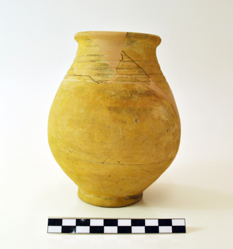 Boccale con orlo esoverso, ingrossato e arrotondato, breve collo decorato da cinque scanalature parallele, corpo arrotondato, piede ad anello. Il vaso risulta scentrato rispetto all'asse mediano, con deformazioni nel corpo e nell'orlo avvenute probabilmente al momento della collocazione nel forno. L'argilla è di colore nocciola e la superficie esterna giallognola.