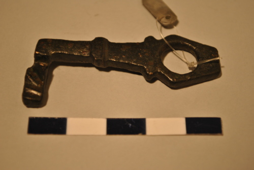Chiave a scorrimento con stelo rettangolare modanato. Elemento trasversale a tre denti triangolari (ne rimane uno). Anello poligonale.