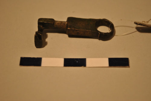 Chiave a scorrimento con anello modanato. Stelo rettangolare. Innesto a sezione triangolare. Elemento trasversale con quattro denti triangolari(di cui uno frammentato).