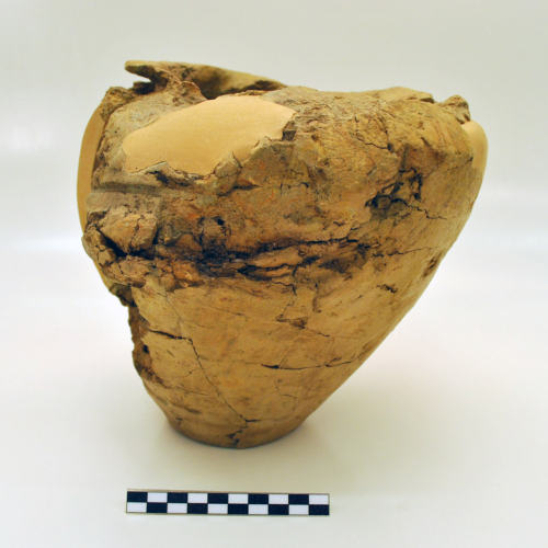 Olla con corpo ovoide, rastremato verso il fondo piatto, orlo a tesa orizzontale, piatta. Impasto grossolano di colore giallo-ocra con tracce di ingobbio rossastro sulla superficie esterna.