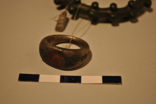 Anello digitale di notevole spessore. Sulla vera serie di simboli/lettere. Castone con corniola rossa non decorata, scheggiata. Unito al bracciale XI, 315-MANVe 603, Correr= WLT-014100_WRC-1062251.