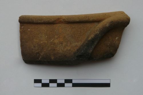 orlo arrotondato e ripiegato all'esterno, pareti leggermente curvilinee, fondo piano, prese a bastoncello "a maniglia" applicate sull'orlo e in prossiità del fondo. Corpo ceramico molto ricco di inclusi quarziferi, che, affiorando, rendono la superficie del recipiente scabra al tatto