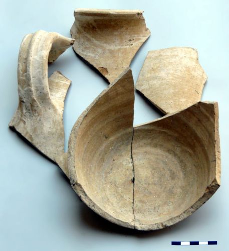 tipo Gazzo 5: orlo a tesa orizzontale a profilo squadrato, collo troncoconico, corpo ovoide e fondo piano; ansa a nastro tricostolata impostata sull'orlo e sulla spalla. Corpo ceramico morbido con numerosi inclusi affioranti che rendono le superfici ruvide