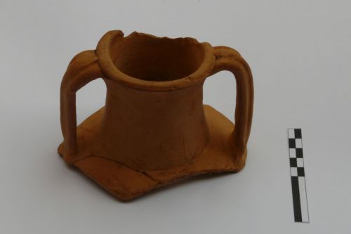 orlo a tesa orizzontale a profilo squadrato, collo troncoconico, corpo ovoide e fondo piano; ansa a nastro tricostolata impostata sull'orlo e sulla spalla