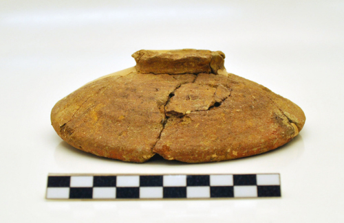 Ciotola/coperchio dellolla IG 12937, con calotta emisferica, bordo arrotondato, presa cilindrica cava con decorazione sul bordo a tacche trasversali fatte manualmente e solcatura sulla parete esterna per una migliore presa. Impasto grossolano con inclusi calcarei e micacei, di colore giallo ocra.
