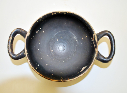 Kylix con orlo assottigliato, vasca carenata, piede ad anello, anse a bastoncello, orizzontali e non ripiegate ad orecchio, sul fondo del piede, non verniciato, pronunciato umbone di tornitura. Allinterno della vasca al centro, cerchiello impresso e quattro giri concentrici di rotellature a trattini obliqui verso s., incisi. Sul fondo esterno del piede una X graffita a crudo. L'argilla è di colore rosata, la vernice è nera opaca, diluita, chiazze rossastre sulla parete esterna, in prossimità del piede, tracce di impronte digitali.