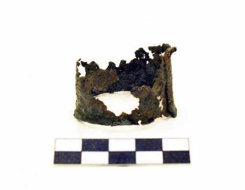 Bicchiere o situla miniaturistica di forma cilindrica con bordo del fondo estroflesso, espanso per permettere la saldatura con la lamina circolare del fondo, ribattitura e martellatura delle due estremità della sottile lamina per la chiusura del recipiente.