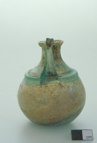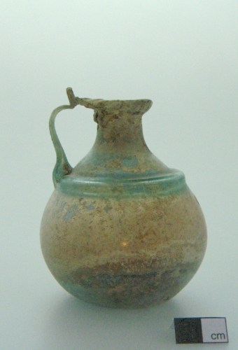 labbro estroflesso con orlo ripiegato verso l'interno, breve collo cilindrico che si allarga in corrispondenza dell'attacco alla spalla, sottolineato dalla presenza di un cordoncino in rilievo, ventre sferoidale e fondo piatto. L'ansa bicostolata è saldata al labbro con un'apofisi ad "orecchietta" e fissata sulla spalla in corrispondenza del cordoncino in rilievo. Vetro verdeazzurro, trasparente.