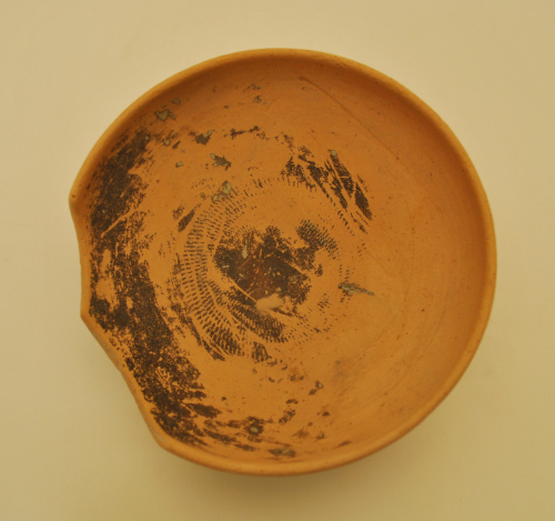 Coppetta con orlo poco rientrante e assotigliato, parete inflessa verso lorlo, piede ad anello a profilo obliquo, sulla vasca interna, al centro, fascia di rotellatura a trattini obliqui incisi verso s., fondo del piede con pronunciato umbone di tornitura e con vernice di colore marrone scuro. L'argilla è di colore beige-arancione, la vernice è nero-bruna.