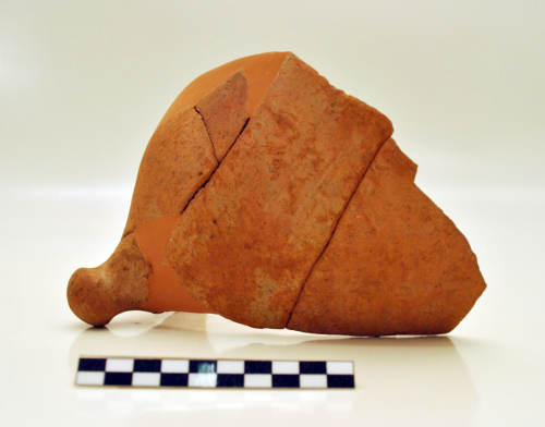 Anforetta con puntale a bottone e corpo ovoidale. L'argilla è di colore rosso-mattone, depurata, tracce di tornitura sulla parete interna.