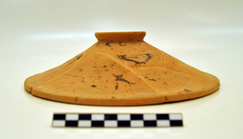 Patera con orlo diritto, pareti scampanate a profilo quasi rettilineo, piede ad anello a profilo obliquo, sulla parete esterna, tracce di decorazione a fasce con elementi geometrici, si riconoscono 2 fasce orizzontali, concentriche, tagliate da fasce verticali. L'argilla è di colore beige-arancione, la vernice è nero-bruna, opaca.