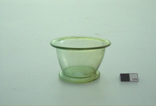 labbro esoverso e ribattuto all'esterno a cordoncino, corpo troncoconico e fondo leggermente concavo con piede ad anello. Vetro verde chiaro trasparente.