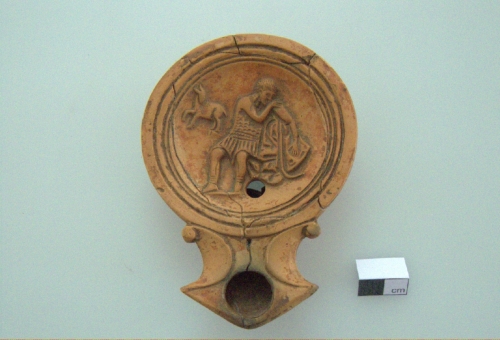 lucerna a volute semplici e becco triangolare, caratterizzata da una spalla inclinata verso l'interno che presenta tre cordoli digradanti verso il disco e tre circonferenze incise. Sul disco, lievemente concavo è raffigurato in rilievo un pastore con pedum, rivolto a sinistra e, sullo sfondo, un agnello con il capo sempre rivolto a sinistra. La base è piatta e delimitata da una circonferenza incisa. Corpo ceramico rosato con tracce di vernice rosso-arancio. La matrice è viva.