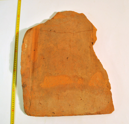 Frammento di grosso embrice/tegola di forma rettangolare con alette laterali a sezione rettangolare, spigoli interni arrotondati e con depressione (incavo) alla base, sulla faccia superiore. Al momento del ritrovamento si trovava in posizione verticale tra la spalla e la pancia dell'anfora segata (IG 46037) contenente la sepoltura di infante. L'argilla è di colore arancio, mediamente depurata.