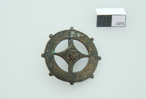 fibula a cerniera (Radfibel) con disco piatto, lavorato a giorno e decorato lungo il bordo da otto appendici semicircolari, costituito da quattro raggi a lati inflessi che si dipartono da un pomello centrale, chiuso tra due circonferenze incise; staffa di forma rettangolare e ardiglione a sezione circolare.