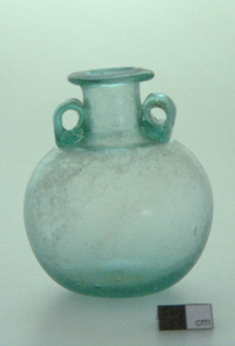 labbro ripiegato e appiattito a tesa; collo cilindrico; ventre sferoidale; fondo piatto. A metà circa del collo sono saldate le due anse delfiniformi impostate sulla spalla, modellate a parte e applicate a caldo. Vetro azzurro, trasparente.