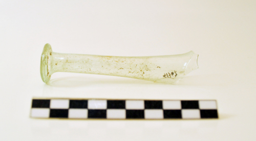 Balsamario con orlo esoverso ribattuto, collo cilindrico che si allarga verso la spalla. Il vetro è di color verde acqua, trasparente.
