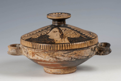 Il reperto present un piede ad anello, vasca a profilo emisferico schiaciato, orlo leggermente obliquo e labbro arrotondato. In posizione speculare, sono presenti due anse orizzontali, con sezione a nastro insellato. Il coperchio presenta un orlo verticale, corpo a profilo troncoconico e presa a pomello, superiormente appiattita. La superficie esterna del recipiente è decorata con un tralcio vegetale orizzontale che corre lungo tutta la superficie in corrispondenza dell'orlo mentre il coperchio è decorato con due figure femminili volte a sinistra, racchiuse entro palmette e racemi floreali stilizzati. Le due figure femminili, dipinte in bianco e rappresentate con i medesimi dettagli iconografici, sono raffigurate con una raffinata cuffia, decorata con svastiche e nastri stilizzati, e una collana resa con una sequenza di tratti puntiformi. Alla sommità del pomello piano è presente un probabile motivo vegetale stilizzato.