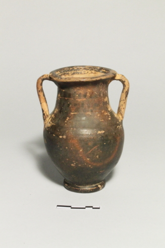 Il reperto presenta un piede ad anello, corpo a profilo ovoidale, spalla obliqua, largo collo a profilo troncoconico, orlo leggermente estroflesso e labbro appiattito superiormente. In posizione speculare, sono presenti due anse a nastro che si impostano poco al di sotto del labbro.