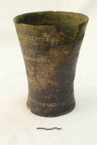 Il reperto presenta un piede a disco, corpo a profilo troncoconico svasato superiormente, orlo indistinto e labbro assottigliato. Nel corpo è presente un decoro formato da una sequenza di quattro linee parallele orizzontali incise, campite da trattini obliqui.