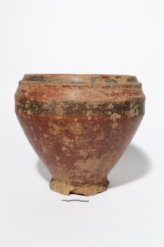 Il reperto presenta un piede a disco distinto, corpo profilo ovoidale, spalla marcata da nervature in rilievo, così come l'orlo leggermente entroflesso, caratterizzato da un labbro arrotondato. Il corpo è dipinto in rosso mentre sulla spalla e l'orlo sono presenti due larghe fasce orizzontali dipinte in nero.
