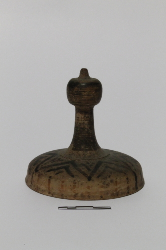 Il reperto presenta un corpo "a calotta" con orlo leggermente obliquo e labbro estroflesso e arrotondato, presa a stelo cilindrico terminante con un pomello arrotondato con sommità puntuta. Nel corpo è presente un decoro geometrico a motivi angolari, dipinto in nero.