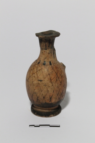 Il reperto presenta un basso piede ad anello distinto, corpo a profilo ovoidale, sottile collo cilindrico, grosso orlo "a imbuto", largo labbro appiattito superiormente e attacco di piccola ansa a sezione ellittica. Il corpo è caratterizzato da una fascia delimitata da due larghe linee orizzontali dipinte in nero, campita da un decoro "a reticolo". In corrispondenza del collo è presente una sequenza di linee verticali dipinte in nero.