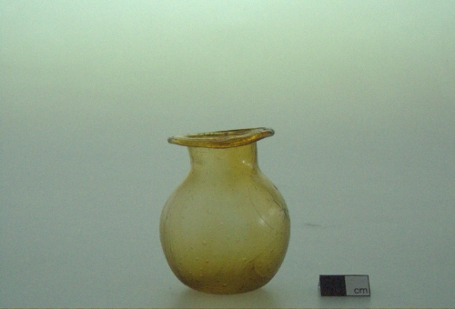 labbro estroflesso, ribattuto all'interno e appiattito, breve collo cilindrico, spalla ribassata, ventre ovoidale schiacciato e fondo piano. Vetro giallo trasparente.