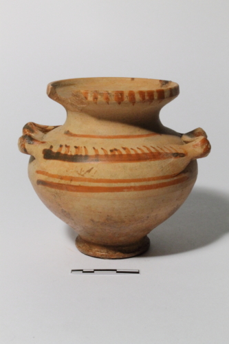 Il reperto presenta un piede ad anello, corpo a profilo ovoidale, breve collo cilindrico, orlo estroflesso e labbro verticale assottigliato; in corrispondenza della spalla, in posizione speculare, sono presenti due anse orizzontali bifide rientranti. Nel corpo e nel collo sono presenti sottili linee orizzontali dipinte in rosso mentre nella spalla compare una linea dipinta in rosso, superiormente marcata da una sequenza di trattini obliqui. Piccoli tratti verticali dipinti in rosso marcano esternamente anche il labbro. padova p. 214 n. 28