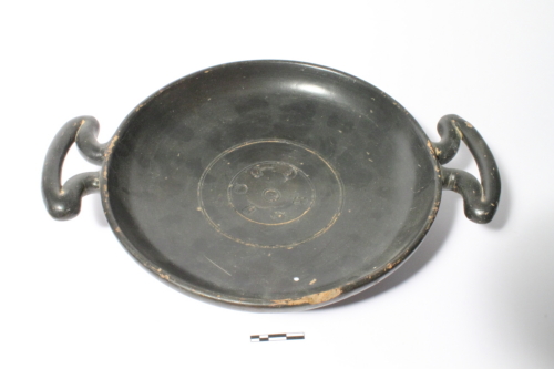 Il reperto presenta un basso piede ad anello, vasca larga e poco profonda a profilo arrotondato, orlo verticale leggermente inclinato esternamente e labbro assottigliato; in posizione speculare, poco al di sotto del labbro si impostano due anse orizzontali "ad orecchia". Al centro del cavetto, racchiuse ebtro due linee concentriche incise, sono presenti sei stampigliature raffiguranti motivi vegetali molto stilizzati disposte in circolo e una circolare in posizione centrale.