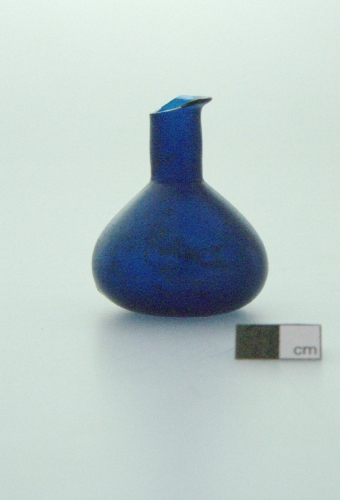 labbro estroflesso; collo cilindrico, leggermente strozzato alla base e di lunghezza inferiore a quella del ventre; ventre piriforme; fondo piatto. Vetro blu, trasparente con bolle dovute a difetti di fabbricazione.
