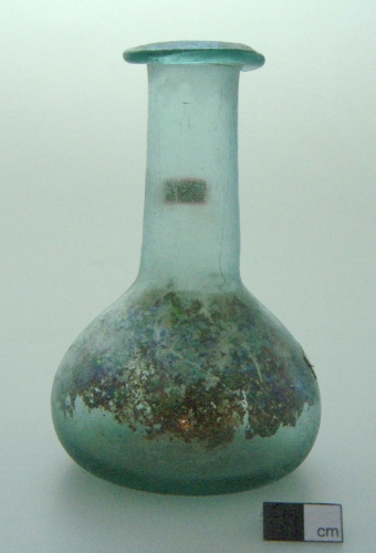 labbro a sezione triangolare, appiattito a tesa; collo cilindrico; ventre campaniforme; fondo piatto. Vetro verdeazzurro, trasparente.