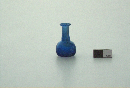 labbro estroflesso e ribattuto a cordoncino; collo cilindrico, leggermente strozzato alla base; ventre sferoidale; fondo piatto. Vetro blu, trasparente.