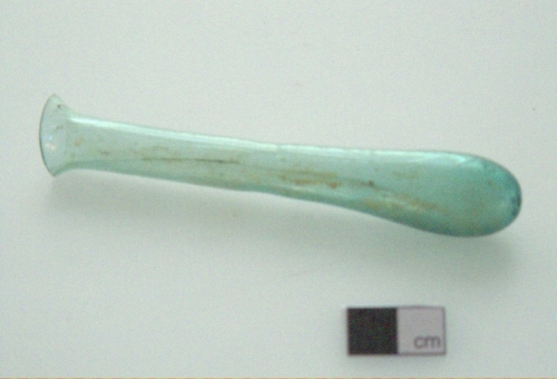 labbro estroflesso con orlo tagliato e levigato;collo cilindrico, strozzato alla base, di lunghezza pari a quella del ventre; ventre tubolare; fondo convesso. Vetro verdeazzurro, trasparente.