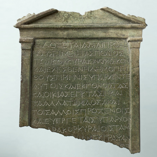 - ISCRIZIONI all'interno dello spazio epigrafico - ΕΔΟΞΕ ΤΑ ΑΛΙΑ ΠΡΟΞΕ/ ΝΟΥΣ ΕΙΜΕΝ ΤΑΣ ΠΟΛΙΟΣ/ ΤΩΝ ΚΟΡΚΥΡΑΙΩΝ ΛΥΚΙΣΚΟΝ/ ΚΑΙ ΕΧΕΣΘΕΝΗ ΔΗΜΟΠΕΙ/ ΤΟΥΣ ΠΡΙΗΝ(Ε)ΙΣ ΥΠΑΡΧΕΙΝ ΤΕ/ ΑΥΡΟΙΣ ΚΑΙ ΕΚΓΟΝΟΙΣ ΓΑΣ/ ΚΑΙ ΟΙΚΙΑΣ ΕΓΚΤΑΣΙΝ ΚΑΙ/ ΤΑ ΑΛΛΑ ΤΙΜΙΑ ΟΣΑ ΚΑΙ/ ΤΟΙΣ ΑΛΛΟΙΣ ΠΡΟΞΕΝΟΙΣ/ ΚΑΙ ΕΥΕΡΓΕΤΑΙΣ ΥΠΑΡΧΟΝ [ΤΑ Π]ΑΡΑ ΚΟΡΚΥΡΑΙΟΙΣ ΤΑΝ/ [ΔΕ ΠΡΟΞΕ] ΝΙΑN ΕΚΓΡΑΦΑΝ/[ΤΑΣ ΕΙΣ ΧΑΛΚΩΜΑ ΑΝΑ] ΘΕ [ΜΕΝ...] - lettere capitali - Incisione - greco