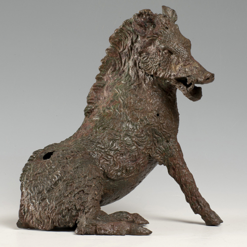 La piccola scultura raffigura un cinghiale, accucciato sulle zampe posteriori mentre si solleva con quelle anteriori. Il muso, dalle fauci aperte, si volge verso destra. Il pelo, ispido e irsuto, è definito fin nei dettagli delle singole ciocche.