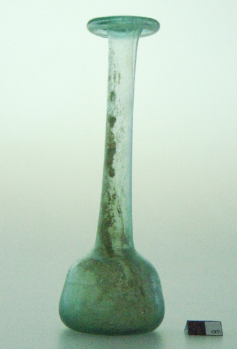 labbro estroflesso con orlo ripiegato all'interno;lungo collo cilindrico strozzato alla base; spalla arrotondata;ventre campaniforme; fondo piatto. Vetro verdeazzurro, trasparente.