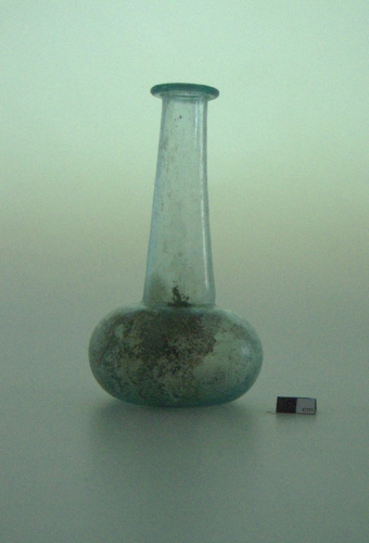 labbro esoverso, ingrossato e appiattito a tesa;lungo collo cilindrico, strozzato alla base; corpo cipolliforme;fondo piatto. Vetro verdeazzurro, trasparente.