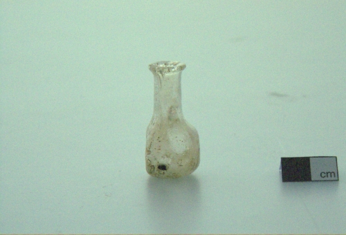 labbro esoverso con orlo ingrossato e ribattuto all'interno; collo cilindrico; corpo sferoidale con quattro depressioni ottenute a caldo;fondo piatto. Vetro incolore, trasparente.