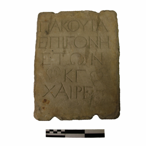 - ISCRIZIONI Il testo si trova centrato sulla stele. - ΠΑΚΟΥΙΑ/ ΕΠΙΓΟΝΗ/ ΕΤΩΝ/ ΚΓ/ ΧΑΙΡΕ - lettere capitali - incisa - greco