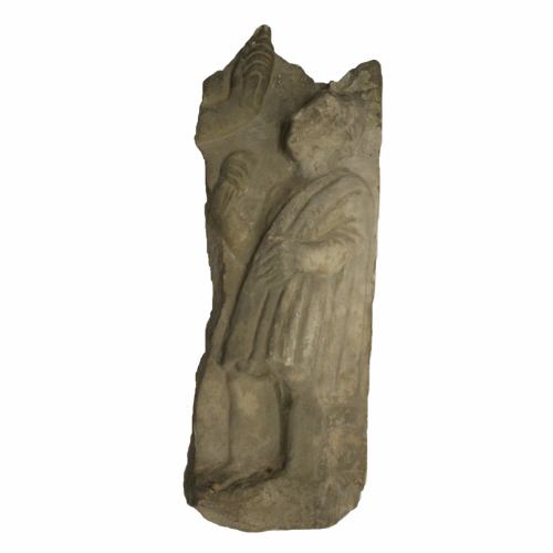 Il frammento, parte di un rilievo di consistenti dimensioni, ritrae una figura maschile stante vestita di toga, davanti ad un'altra figura, per la gran parte perduta, molto più alta rispetto all'altra, di cui si nota solo la mano sinistra, piegata a stringere un attributo.