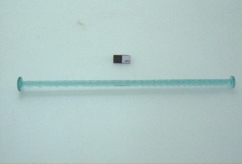 Estremità appiattite a forma discoide; corpo a sezione circolare, lavorato a torciglione. Vetro azzurro, trasparente.
