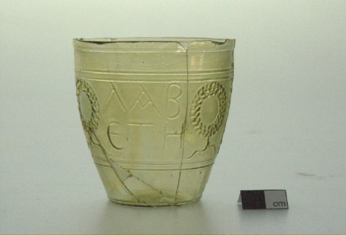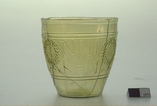orlo tagliato a spigolo vivo; corpo troncoconico decorato da due linee incise sotto l'orlo e incorniciato da due gruppi di linee anulari in rilievo che racchiudono la parte centrale decorata a rilievo da quattro corone che separano un'iscrizione su due righe in lettere greche: ΛAB/E TH/N NI/KEN (Prendi la vittoria); sul corpo due foglie di palma realizzate in rilievo, mascherano, grazie alla nervatura centrale, la linea di giunzione dello stampo; fondo leggermente concavo. Vetro giallo chiaro, trasparente.