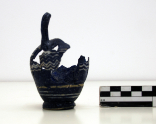 Oinochoe con corpo ovoidale caratterizzato da leggere solcature verticali, decorato da una serie di filamenti bianchi a zig-zag che corrono orizzontalmente all'altezza della spalla, mentre altri filamenti paralleli, di cui tre bianchi e uno giallo, ornano la parte inferiore; piccola ansa verticale a bastoncello, ampio piede a disco sottolineato da un filamento giallo.