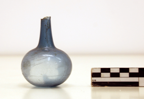 Balsamario con collo troncoconico, corpo sferoidale schiacciato, fondo concavo.