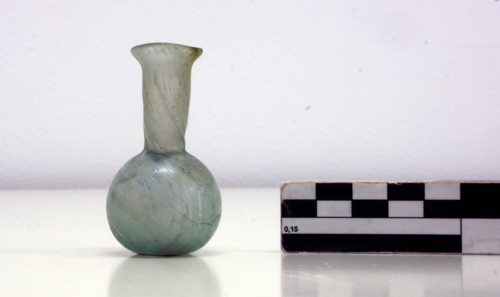 Balsamario con orlo estroflesso, tagliato e arrotondato, con alto collo cilindrico sottolineato da una strozzatura, con corpo sferoidale e piccola base leggermente concava.