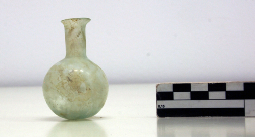 Balsamario con orlo estroflesso, tagliato e arrotondato, con collo cilindrico sottolineato alla base da una strozzatura, con corpo sferoidale e piccola base piana.