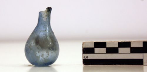 Balsamario con orlo orizzontale ribattuto, con breve collo cilindrico, con corpo conico arrotondato e base piana.