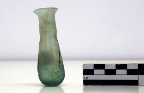 Balsamario con orlo estroflesso, tagliato e arrotondato, con breve collo cilindrico sottolineato alla base da una strozzatura, con corpo piriforme allungato e piccola base leggermente concava.